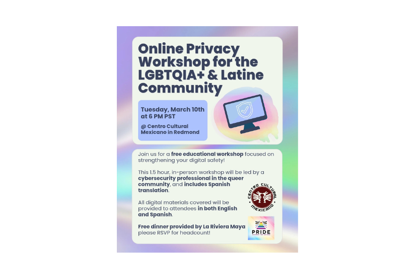 Centro Cultural Mexicano 7945 Gilman St, Redmond, WA, United StatesClick here to RSVP and find more info. Join Centro Cultural Mexicano and Pride Across the Bridge for an Online Privacy Workshop for the LGBTQIA+ & Latine Community, a free educational workshop focused on strengthening your digital safety. This 1.5-hour, in-person workshop will be led by a cybersecurity professional in the queer community and includes […]